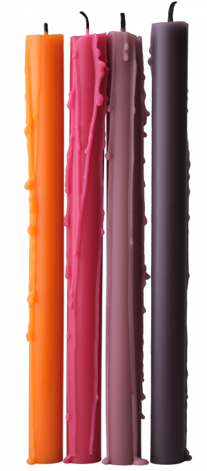 4. Wosk pozostawia ślady na powierzchniach, dlatego lepiej jest używać podstawek. Osobiście preferuję płaskie podstawki. Na nich świeczki tworzą abstrakcyjny woskowy obraz, który ozdabia wnętrze. Jeśli używasz naszej podstawki, wkładaj świeczki ciasno i upewnij się, że są ustawione równo, pod kątem 90°. Ze względu na nierówności będą szybciej palić.