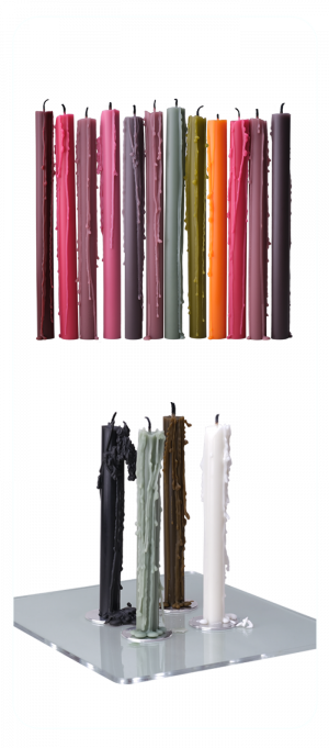 4. Wosk pozostawia ślady na powierzchniach, dlatego lepiej jest używać podstawek. Osobiście preferuję płaskie podstawki. Na nich świeczki tworzą abstrakcyjny woskowy obraz, który ozdabia wnętrze. Jeśli używasz naszej podstawki, wkładaj świeczki ciasno i upewnij się, że są ustawione równo, pod kątem 90°. Ze względu na nierówności będą szybciej palić.