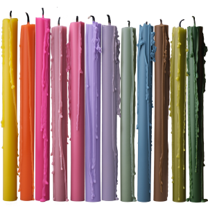 4. Wosk pozostawia ślady na powierzchniach, dlatego lepiej jest używać podstawek. Osobiście preferuję płaskie podstawki. Na nich świeczki tworzą abstrakcyjny woskowy obraz, który ozdabia wnętrze. Jeśli używasz naszej podstawki, wkładaj świeczki ciasno i upewnij się, że są ustawione równo, pod kątem 90°. Ze względu na nierówności będą szybciej palić.